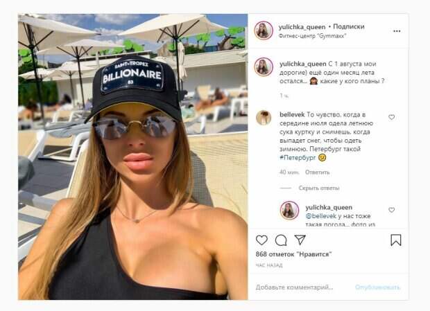 Девушка, как можно заметить, отдыхала у бассейна. Об этом пишет Politeka.net со ссылкой на страничку знаменитости. "С 1 августа мои дорогие) ещё один месяц лета остался... какие у кого планы ?", - написала Юлия. Фанаты поставили почти 1 тысячу лайков и написали комментарии: "То чувство, когда в середине июля одела летнюю сука куртку и снимешь, когда выпадет снег, чтобы одеть зимнюю. Петербург такой", "Ну что за красотка !!!!", "Тусить. Без вариантов", "Королева, дорогая, моя дорогая, люблю тебя", "Богиня", "Очень привлекательная". Сообщалось, что невеста украинского футболиста Артема Шабанова Юлия сверкнула идеальной фигурой в роскошном нижнем белье. Красотка позировала возле окна в черном лифчике и поясе для чулок. На фото прекрасно видно ее спортивную фигуру: плоский животик, пышную грудь, стройные ножки и подкачанные плечи. «Закину ещё эту)) как будто фотка для журнала», - подписала девушка снимок. Напомним, невеста Шабанова сбросила одежду, чулки и показала себя во всей красе А еще Politeka писала, что невеста Шабанова соблазнительно выгнулась, засветив лишнее в пикантном белье Также Politeka сообщала, что невеста Шабанова специально выставила напоказ свои прелести без белья