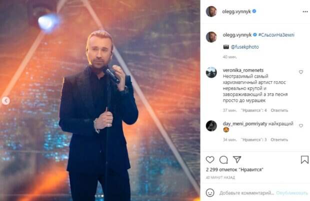 Воротник пиджака был с причудливой гравировкой. "#СльозиНаЗемлі", - подписаны кадры. Это название одной из самых чувственных песен Винника. Учитывая серьезные переживания лирического героя, артист исполнял хит с немного грустным и отрешенным выражением лица. Пользователи с энтузиазмом обсудили увиденное, не скрывая эмоций, которые в них пробуждает эта песня: "Неотразимый, самый харизматичный артист, голос нереально крутой и завораживающий, а эта песня просто до мурашек"; "И песня, и исполнение западают в душу. Браво, Олег"; "Добрый день! Очень хорошее выступление, но грустное. Желаю Вам, Олег Анатольевич, удачных концертов!"; "Обожаю такой Ваш образ❤️"; "Браво! Это моя любимая песня - чувственная, нежная, с глубоким смыслом и пронизывающая душу