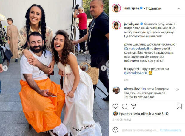 net, об этом опыте звезда рассказала в своем Инстаграм. «Каждый раз, когда я попадаю на киноплощадку, я не могу привыкнуть к этому мэджику. Это совершенно другой мир! Очень счастлива, что стала частью «Смаку свободи». Спасибо всей команде. Уже жду и завидую всем нам, ведь совсем скоро мы увидим премьеру в кино», - написала певица. Она поделилась серией фото, на которых показала себя и своих коллег на съемочной площадке. В частности, певицу можно увидеть в джинсах-клеш в окружении множества мыльных пузырей. Поклонники артистки тут же принялись комментировать публикацию. «Ждем», «Какая красотка», «Разноцветные пузырьки .... Вам так они идут!», «И затем, бегом на репетиции, а то получишь от Кухар двоечку», - пишут люди. Напомним, Джамала из "Танцiв з зiрками" в неоновом платье раскрыла личные секреты красоты. Как сообщала Politeka, Джамала из "Танців з зірками" показала свою старшую сестру-красотку. Также Politeka писала, что Джамала в красном платье с разрезом засветила похудевшие формы к "Танці з зірками".