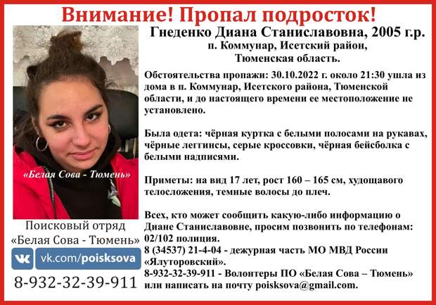 С 30 октября в Тюменской области искали девушку-подростка Диану Станиславовну Гниденко. В вечернее время 17-летняя девушка ушла из дома в Исетском районе Тюменской области и не вернулась. О причинах её ухода и местонахождении было ничего неизвестно. Поисковики отряда «Белая Сова — Тюмень» сообщают, что Диана нашлась живой.