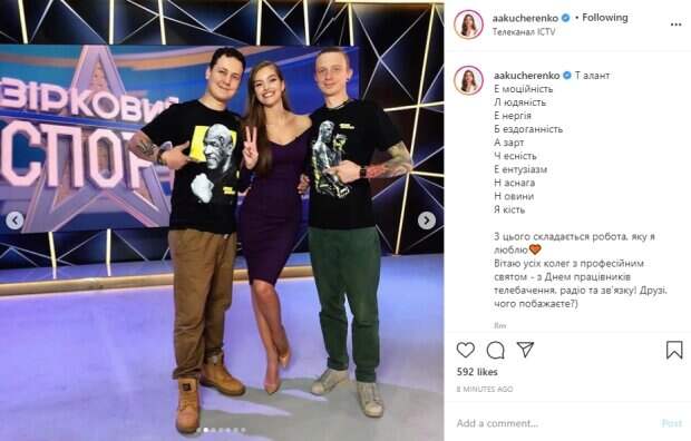 "Мисс Украина-2016" и жена ведущего Дмитрия Комарова, Александра Кучеренко показала, как работает на телевидении Как пишет Politeka.net, вот уже долгое время девушка ведет программу "Звездный спорт" на телеканале ICTV. На своей странице в соцсети "Инстаграм" знаменитость выложила подборку кадров со съемок и трогательно поздравила коллег с профессиональным праздником.
