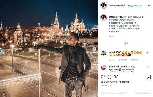 Для своей вечерней прогулки певец выбрал образ настоящего мачо. На нем серые джинсы с ремнем и потертостями, черная футболка и серый плащ, который артист распахнул, продемонстрировав стильный шарф. Лазарев на фото уверенно позирует на камеру, глядя куда-то вдаль. «Парк Зарядье в Москве!! Обязательно к посещению!! Оч красиво) прекрасные виды на Кремль», - подписал снимки артист. Его поклонники тут же принялись комментировать пост. «Красивый вид... Невероятный», «Красивый на красивом фоне!», «В тебе сочетается решительность и мужественность. Дерзость и слабость. Этот мой самый любимый опьяняющий коктейль!», «Вы очень красивый. Попадаете прямо в самое сердце», «И вид обалденный, и главный герой тоже», «Фото просто огонь», - пишут люди. До этогомы писали, что Лазарев поделился фото, на котором позирует с двумя собаками породы лабрадор. Артист присел на корточки, чтобы обнять своих четвероногих приятелей. При этом Лазарев одет в джинсы, светло-бежевый пиджак и чуть более темный гольф ему в тон. Артист выглядит очень довольным компанией, в которой он оказался. Напомним, "любовник" Ани Лорак показал подросшего сына и вызвал фурор элегантным видом: "Папина копия". Как сообщала Politeka, «любовник» Лорак Лазарев свел с ума улыбкой в харизматичном образе. Также Politeka писала, что потенциальная свекровь Ани Лорак сразила молодостью и красотой, в сети ажиотаж: "Вам с ней очень повезло!".