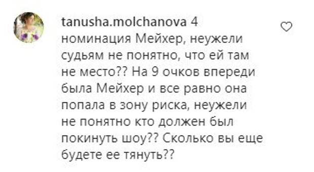В результате, Сергей Танчинец и Яна Цибульская покинули шоу. Однако в Сети разгорелись бурные дискуссии по этому поводу. Многие зрители считают, что покинуть проект должна была Надежда Мейхер. «При всём уважении к Наде, но ей явно пора домой. Сдала позиции, усталость даёт своё», «Абсолютно нет! Мейхер пора домой, слишком много пафоса и наигранности, надоело!», «Еле выпихнули Фреймут, теперь не можем Мейхер! 4 номинации было, вы серьезно? Да не голосуют за нее люди, хватит завышать оценки и спасть на вылетах!!!», «Надя, вали домой», «ждала ухода Мейхер, очень жаль, что судьи, как обычно, сделали из Нади королеву, которой она не является», «Хватит спасать Мейхер!», «4 номинация Мейхер, неужели судьям не понятно, что ей там не место?? На 9 очков впереди была Мейхер и все равно она попала в зону риска, неужели не понятно кто должен был покинуть шоу?? Сколько вы еще будете ее тянуть??», - возмущаются в сети. Напомним, что смелая Мейхер без штанов показала все грани своей "души": "Пусть любуются...". Как сообщала Politeka, бесстыжая Мейхер развинула ноги и засмущала видом в прозрачной кофте: "Она чудо!". Также Politeka писала, что эффектная Мейхер утонула в прозрачных рюшах, доведя до безумия: "Образ напомнил. ..".