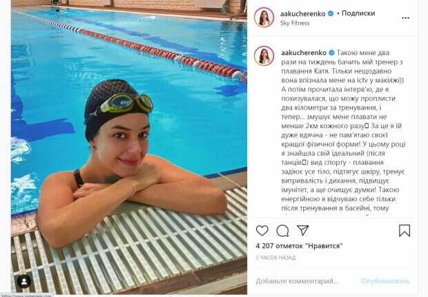 Звезда была без макияжа, она смотрела в камеру и улыбалась. Жена Комарова рассказала, что занимается плаванием два раза в неделю, а тренер лишь недавно узнала ее по телевизору при макияже. В одном из интервью Александра призналась, что может проплыть два километра за тренировку, узнав об этом тренер стала требовать плыть указанное расстояние на каждом занятии. "За это я ей очень благодарна - не помню своей лучшей физической формы! В этом году я нашла свой идеальный (после танцев
