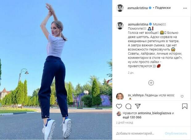 Известная российская актриса Кристина Асмус вновь изумила своих фанатов Об этом передает Politeka со ссылкой на Instagram знаменитости. Так, в одном из своих сообщений, она пожаловалась на то, что сорвала голос и попросила у фолловеров совета, что ей делать. "Молю!!!! Помогите!!!!