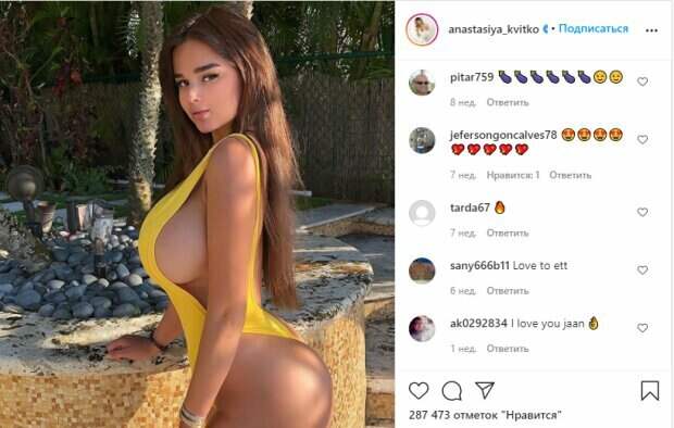 Об этом пишет Politeka.net со ссылкой на фан-страничку знаменитости. Фанаты поставили тысячи лайков и написали комментарии: "Она моя мечта потребления", "Хорошая детка", "Красивая мамасита", "Ты супер хороша", "Богиня", "Горячо", "Ты прекрасна", "Красиво очень соблазнительно", "Ты супер кошечка", "Восторг всегда", "Привет, мама ты очень хорошая", "Я люблю тебя, прекрасная принцесса", "Не могу больше, люблю", "Девушка прекрасная", "Привет, любимая, моя прекрасная принцесса-русалка, ты подняла шумиху, моя сладкая любовь", "Солнце просто восхитительно, принцесса ласково выглядит из Турции". Сообщалось, что российская модель Анастасия Квитко показала пикантный кадр из отдыха в новом бикини. Квитко позировала к объективу боком, чтобы показать тем самым не только выскользнувшую грудь из-под тонкой ткани купальника, но еще и посветить неестественно пышными бедрами. Напомним, русская Кардашьян сверкнула аппетитными "персиками" в королевском декольте Также Politeka писала, что русская Кардашьян расстегнула платье и аппетитно вывалила пышные "дыньки" А еще Politeka сообщала, что русская Кардашьян в непристойном декольте с трудом удержала бюст шестого размера