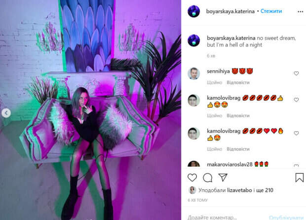 Красотка выбрала боди с глубоким декольте, чтобы иметь возможность показать свой большой бюст. Кроме этого, Екатерина не стала надевать штаны, засветив свои стройные ножки, которые при помощи фотошопа сделали еще длиннее. Чтобы фото получилось еще горячее, Катерина засунула средний палец в рот. Снимок получился восхитительным, но дедушке лучше не видеть его. «Не сладкий сон, но я адская ночь», - подписала фото девушка. В комментариях красотке оставили массу приятных слов. Оценила фото и тетя Кати, известная российская актриса Елизавета Боярская. «Ну красотка», «Супер кадр. Вау», «Ты красавица и умница», «Красивый мейк и клевый образ», - пишут пользователи сети. Как известно, Екатерина – это дочка сына Михаила Боярского Сергея, который построил успешную карьеру в политике. Напомним, что Екатерина Боярская в мини-шортах изогнулась до неприличия, огорошив признанием: «Пусть тронет…». Как сообщала Politeka, Екатерина Боярская вывалила свой срам в бесстыжем топе: с такой не заскучаешь. Также Politeka писала, что Екатерина Боярская едва впихнула шестой размер в узкий топ, фото: "Уже скоро смогу...".
