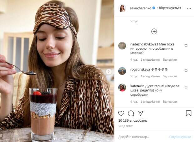 л. семен чиа, гранола, персики или другие фрукты, ежевика или другие ягоды. На ночь нужно замочить семена чиа в стакане молока. Утром нужно взбить в блендере любые фрукты и вылить их на дно стакана. Далее добавить гранолу, сверху молочную смесь с чиа. Четвертый слой десерта – это перемолотые блендером ягоды. «Получается полезно, вкусно и красиво настолько, что хорошее настроение утром появляется сам собой и остается на весь день)», - отметила Кучеренко. За несколько часов ее пост собрал более 10 тысяч лайков. В комментариях девушке оставили массу комплиментов и слов благодарности. «При всей нелюбви к чиа, с таким исполнением можно попробовать», «Спасибо за рецепт. Я утром люблю смузи с витаминным белковым коктейлем. Добавляю любые ягоды или фрукты, иногда делаю с зеленью. Очень вкусно и полезно», «Так аппетитно выглядит. И хоть я уже позавтракала, но я бы съела Вашу вкусняшку», «Ням-ням, должно быть очень вкусно», - пишут пользователи сети. Напомним, что Дмитрий Комаров и его молодая жена похвастались отдыхом «с огоньком», яркие кадры: «Вот так надо!». Как сообщала Politeka, красавица-жена Дмитрия Комарова приковала все внимание бездонным декольте: "Конфеточка". Также Politeka писала, что Александра Кучеренко пленила изгибами в купальнике: «Красивее русалочку не найти».