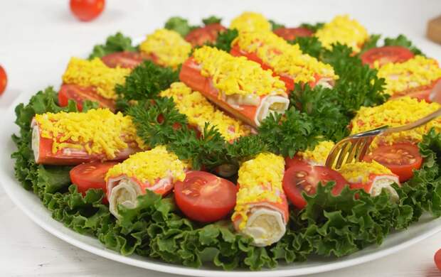 Перемешать. Крабовые палочки аккуратно развернуть. Смазать начинкой, свернуть рулетом и разрезать пополам. Каждую палочку смазать сверху майонезом, опустить в яичные желтки и выложить на листья салата. Украсить зеленью и помидорами. Подробный рецепт смотрите в видео: праздничная закуска