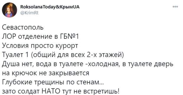 Об этом сообщила блогер RoksolanaToday&КрымUA в Twitter и разметила доказательства своим словам в виде фото из больницы. "Севастополь. ЛОР-отделение в ГБ №1. Условия просто курорт в аду. Туалет 1 (общий для всех 2-х этажей). Душа нет, вода в туалете холодная, в туалете дверь на крючок не закрывается. Глубокие трещины по стенам... зато солдат НАТО тут не встретишь!" - с иронией пишет блогер. В начальный период оккупации российские пропагандисты наперебой критиковали Украину за "разгромленный Крым", которому якобы никто не уделял внимания. Тогда россияне обещали в кратчайшие сроки навести порядок на полуострове, превратив его в курорт, которому позавидуют даже в Турции. Но, как российская власть исполняет обещания можно заметить по снимкам из разрушенной больницы Севастополя. Неудивительно, что в последнее время в сети можно встретить недовольные комментарии крымчан о жизни на полуострове под гнетом российских оккупантов. Напомним, оккупанты решили погрузить крымчан в "спецпоезд" из РФ, кадры безумия. Как сообщала Politeka, крымчане пожаловались на отвратительную медицину. Также Politeka писала, что оккупанты в Крыму слили опасные отходы в море, никому нет дела: кричащие кадры.