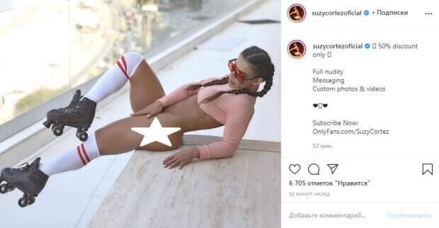 Кортес присела на ступеньку, вытянув накаченную ножку. При этом она обула ролики, похваставшись ими в кадре. Красотка не надела ни штанов, ни трусиков, чем сильно привлекала внимание. На интимное место она положила ладошку, чтобы скрыть его от посторонних глаз. Также на знаменитости был надет розовый топик, оголивший ее тонкую талию и упругий животик. Ее образ завершили стильные очки и две косички. Сьюзи оперлась на локоть, застыв в позе полулежа. Почти за час пост собрал более 6000 лайков и много комментариев от поклонников, которые пришли в восторг от горячего кадра. Ранее мы писали, что Сьюзи Кортес позировала в розовом обтягивающем топе, который слегка оголил ее идеальные изгибы и татуировку. При этом длина топике казалась настолько экстремальной, что груди едва ли не выпрыгивали из-под него. Откровенная красотка предстала без штанов и белья, но, к счастью, кадр был обрезан, поэтому самое интимное удалось скрыть. "Ух, королева!", - написал один из поклонников. Напомним, Сьюзи Кортес предстала в обтягивающем костюме, который создавал иллюзию полной наготы. Красотка сделала селфи у зеркала в этом наряде. Такой образ фигуристой модели собрал немало лестных комментариев и сотни лайков. Напомним, хозяйка самых красивых ягодиц показала пышные прелести в розовом белье А еще Politeka писала, что хозяйка самых красивых ягодиц без трусиков устроила шалости на полу А еще Politeka писала, что хозяйка самых красивых ягодиц без штанов показала "титул" прямо на балконе