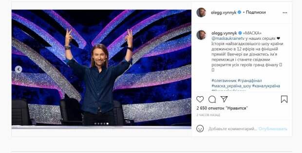 Свою соответствующую публикацию в Инстаграм Винник подкрепил кадрами с финала проекта. На фото артист позировал с коллегами: Олей Поляковой, Настей Каменских, Андреем Данилко и DZIDZIO, а также сам. К слову, DZIDZIO удивил выходкой - забравшись на стол. Винник надел красивую рубашку в черную полоску и джинсы. Наряд отлично подчеркнул фигуру певца. "«МАСКА» в наших сердцах ❤️ История загадочного шоу страны длиной в 12 эфиров на финишной прямой! Вечером вы узнаете имя победителя и станете свидетелями раскрытия всех героев гранд финала