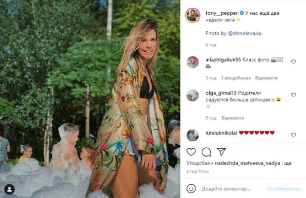 На фотографии Антонина запечатлена в бассейне с густой пеной, в которой кроме нее резвятся дети. Перед камерой она появилась в коротеньких джинсовых шортах и черном лифе от купальника, а сверху накинула пестрый халатик. Ее волосы распущены и чуть растрепаны ветром, а на лице счастливая улыбка. Также Паперная выложила забавное видео, на котором вместе с дочкой плавает на надувных кругах. Здесь красотка запечатлена в стильном черном купальнике, который красиво подчеркнул ее изящную фигурку. И это после недавнего рождения второго ребенка. Восторженные фанаты тут же начали комментировать кадры: "А дети точно твои? По твоей шикарной фигуре и не скажешь", "Как круто проводите лето! Тонечка! Фигура бомба! Девчонки, на отдыхе", "Класс фото", "Родители радуются больше детишек", "Красавица". Напомним, Дочь Сумской с ногами на кресле показала, как проводит свой вечер без детей: "Пока я тут восседаю...". Как сообщала Politeka, Худенькая дочь Ольги Сумской примерила слишком короткую юбку: "Прям как школьница". Также Politeka писала, что Сумская показала свою красотку-дочь, которая переехала жить в Россию: "Балдею от этой мамочки двоих детей".