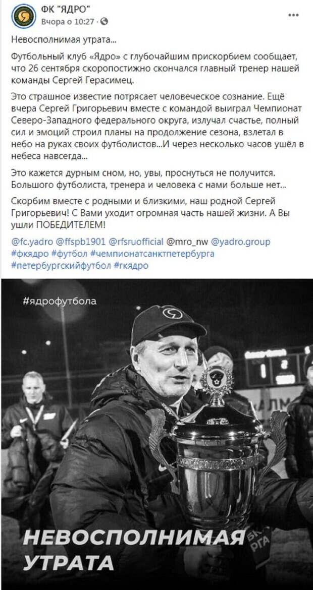 Последние 20 лет он посвятил тренерской работе. ФК «Шахтер» выражает глубокие соболезнования родным и близким Сергея Герасимца», - говорится в сообщении. Также Герасимец выступал за киевское «Динамо», ирпеньскую «Рось», минское «Динамо», «Бней Иегуду», питерский «Зенит», «Каунас», «Динамо-Стройимпульс» и «Торпедо-МАЗ». На 56-м году скоропостижно ушел из жизни экс-футболист «Шахтера» Сергей Герасимец. ФК «Шахтер» выражает глубокие соболезнования родным и близким Сергея Герасимца. pic.twitter.com/CKbnlMcK1h — ⚒FC SHAKHTAR DONETSK (@FCShakhtar) September 27, 2021 Во время тренерской карьеры Герасимец работал с российскими, казахстанскими и армянскими командами. 25 сентября команда «Ядро» под руководством Сергея Герасимца стала победителем МРО «Северо-Запад» в третьем дивизионе. В ночь после игры тренер умер. «Это страшное известие потрясает человеческое сознание. Ещё вчера Сергей Григорьевич вместе с командой выиграл Чемпионат Северо-Западного федерального округа, излучал счастье, полный сил и эмоций строил планы на продолжение сезона, взлетал в небо на руках своих футболистов...И через несколько часов ушёл в небеса навсегда... Это кажется дурным сном, но, увы, проснуться не получится. Большого футболиста, тренера и человека с нами больше нет... Скорбим вместе с родными и близкими, наш родной Сергей Григорьевич! С Вами уходит огромная часть нашей жизни. А Вы ушли ПОБЕДИТЕЛЕМ!», - говорится в сообщении клуба. Напомним, несчастье случилось с юным украинским спортсменом, детали: "Сил родным пережить утрату" Как сообщала Politeka, беда случилась с украинским футболистом просто во время матча: спасти спортсмена не удалось Также Politeka писала, что отец Беленюка погиб при таинственных обстоятельствах, чемпион раскрыл подробности: "Была инсценировка"