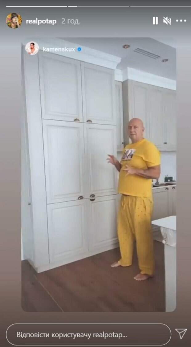 На что Настя рассмеялась и сказала, что такого не бывает. "А у меня бывает!", - сказал Потап, который тут же стал танцевать. Настя прокомментировала танец мужа: "Худеющий медведик!". По всей видимости, Потап занялся своей фигурой, и сидит на диете, за которой пристально наблюдает Настя. Известно, что певец стал ведущим нового развлекательного шоу на канале "1+1", под названием "Липсинк Батл". Соведущей на шоу будет известная Тина Кароль. Чтобы быть в форме и соответствовать своей изысканной смелой компаньонке, придется постоянно поддерживать себя в форме. Не так давно стало известно, что Потап также стал ведущим на шоу "Лига смеха". Видимо певец "перепрофилировался" из репера в телеведущие. Что ж, по отзывам зрителей, он хорошо справился с данной ролью. Напомним, что Кошевого из "Квартал 95" с Потапом подловили за странным занятием, кадры закулисья: "Сегодня вечером...". Портал Politeka информировал, что Потап показал опухшую Каменских с мешками под глазами в обычной жизни. Также портал Politeka рассказывал, что похудевший Потап засветил белоснежный интерьер своего дома по соседству с Горбуновым.