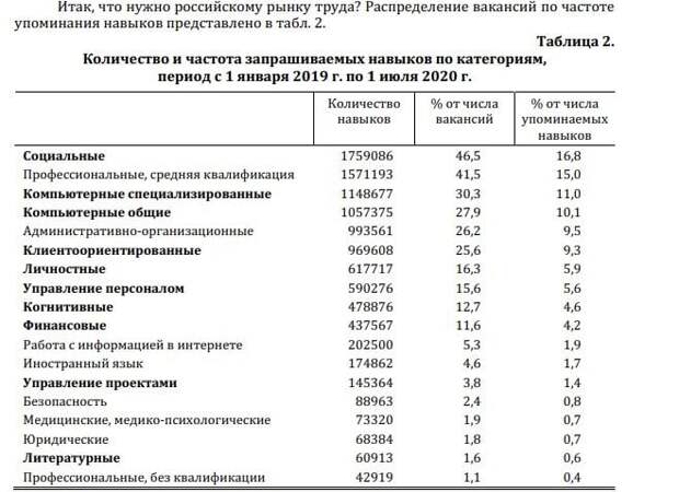 Исследование выполнено в рамках гранта, предоставленного Министерством науки и высшего образования РФ. «… самыми востребованными навыками являются не сугубо профессиональные, а социальные, которые упоминаются в 47% всех вакансий. На втором месте (42% вакансий) идут профессиональные, но средней квалификации, как правило, не требующие высшего образования, а часто и среднего специального. Наконец, «бронзовая медаль» нашего рейтинга может быть вручена специализированным компьютерным навыкам за 31% всех упоминаний. На эту тройку приходится около 43% всех запросов на навыки. А что дальше? Дальше идут три группы навыков, каждая из которых появляется в четверти (26–28%) всех объявлений. Это общие компьютерные, клиентоориентированные и административно-организационные. На личностные навыки и навыки, связанные с управлением людьми, приходится еще по 16%. Наличие когнитивных навыков запрашивается в 13% вакансий, а навыков в области финансов еще в 12%. Итого на перечисленные 10 групп навыков приходится около 85% упоминаний навыков, а каждый из оставшихся навыков встречается не более чем в 5% объявлений. Предоставлено автором. Какие навыки необходимы? Данная таблица не подтверждает популярный тезис об остром дефиците когнитивных или профессиональных навыков высокой сложности, для преодоления которого потребовалась бы значительная переформатизация системы образования. Скорее наоборот, лидируют навыки, которые не являются продуктом высшего образования. Специализированные компьютерные навыки занимают третье место в рейтинге спроса, но в эту категорию входят как навыки продвинутого программирования, так и владение узкоспециализированным программным обеспечением, что во многих случаях не требует длительной и сложной подготовки. Интересно, что лишь в 30% таких вакансий со специализированным компьютерными навыками прямо указано на необходимость иметь высшее образование». Результаты показывают, что на российском рынке наиболее востребованы социальные и клиентоориентированные навыки, а также умения, связанные с профессиями средней квалификации, что отчасти демонстрирует достаточно простую структуру рабочих мест, заключают исследователи. Сообщение Какие соискатели нужны российскому рынку труда? появились сначала на SMI.RU.COM.