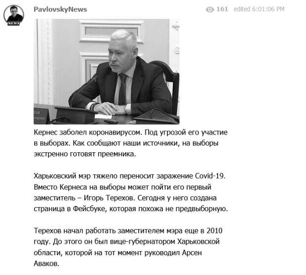 Также сообщается, что сейчас мэр находится в коме, при этом не уточняется, ввели ли его в это состояние искусственно или нет. Известно, что Кернес заболел в первых числах сентября и был госпитализирован на прошлой неделе. При этом он уже давно не появлялся на публике. В свою очередь, Телеграм-канал PavlovskyNews сообщает, что участие политика в выборах оказалось под угрозой, из-за чего его окружение срочно ищет ему преемника. Так, источники сообщают, что вместо Кернеса в выборах может принять участие его первый заместитель Игорь Терехов. Он работает на должности заместителя мэра с 2010 года. До этого он был вице-губернатором Харьковской области, которой на тот момент руководил Арсен Аваков. Отметим, что вскоре после первых сообщений о коме Кернеса Терехов, а также руководитель пресс-службы харьковского городского совета Юрий Сидоренко опровергли эту информацию. «Никакой комы нет. Все слухи о том, что он в коме и без сознания распространяют телеграмм-каналы, близкие к политическим оппонентам. Есть некоторые проблемы со здоровьем, которые абсолютно решаемые. Я у него не был, но медперсонал, который недавно от него вышел, говорят, что он «контактный». Уверяют, что он в сознании», - приводит слова Сидоренко Телеграм-канал Политика Страны. Напомним, появилось фото Кернеса в больничной койке: что известно о состоянии мэра. Как сообщала Politeka, врачи борются за Кернеса, подробности из больницы: "пришлось использовать...". Также Politeka писала, что Кернес в октябре пойдет под суд: что наделал мэр.