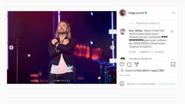 Певец позировал в длинном пиджаке нараспашку и джинсах. "Мы с @kanalukraina уже готовим вам праздник ко Дню Независимости! По многочисленным просьбам спел «Тримай» @soloviyka. На этот раз не меняя голос, как в @maskaukrainetv. Слушайте полную версию песни в моем исполнении ровно через месяц - 24 августа в эфире грандиозного шоу «С Днем рождения, Украина!»", - написал Винник. За час публикация собрала более 2000 лайков и много комментариев. "Олежка, ты лучший