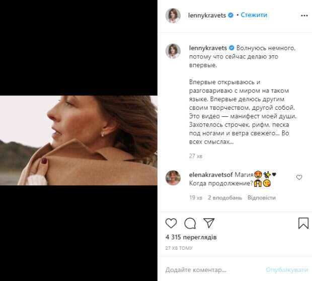 Елена снялась в необычном для себя амплуа - романтическом, глубоком, духовном. В молочных брюках, белом свитере и кофейном тренче Кравец покрутилась перед камерой, "гладя" траву, наслаждаясь единением с природой. Кадры дополнили проникновенные стихи и нежная музыка. "Волнуюсь немного, потому что сейчас делаю это впервые. Впервые открываюсь и разговариваю с миром на таком языке. Впервые делюсь другим своим творчеством, другой собой. Это видео — манифест моей души. Захотелось строчек, рифм, песка под ногами и ветра свежего... Во всех смыслах...", - поделилась сокровенным Кравец. Поклонники остались в полном восторге, о чем поспешили выразить в комментариях: "Магия