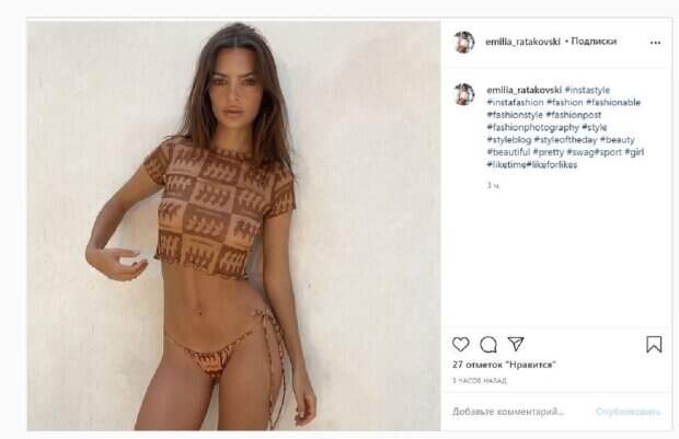 net со ссылкой на страничку знаменитости. На втором фото Эмили была в футболке и джинсах. Звезда позировала на фоне панорамного окна, хвастаясь своей красотой. Девушка смотрела в камеру, а образ дополнила милой цепочкой на шее. Фанаты не ставили лайки и не писали комментарии под публикацией, но так и хочется добавить: "о таком животе мечтают все, бестия". Мы писали, что американская модель Эмили Ратаковски эффектно поманила сочными формами. Горячая брюнетка предстала на черно-белых снимках в кожаной курточке, которую на некоторых кадрах лихо распахнула, блеснув аппетитными "дарами природы" в прозрачном лифчике. Девушка для пущего эффекта сжала бюст руками, доведя публику до экстаза - сердцеедка вышла на охоту. Сообщалось, что супермодель Эмили Ратаковски похвасталась безупречной фигурой, избавившись при этом от белья. Так, на первом снимке Ратаковски позирует в облегающем белоснежном белье на фоне магазина, соблазнительно поглядывая в кадр. Образ знаменитость решила дополнить кроссовками в цвет и практически незаметным макияжем. Напомним, Эмили Ратаковски поразила преображением из домашней "мышки" в королеву красных дорожек Также Politeka писала, что Ратаковски в купальнике спасательниц Малибу сжала аппетитных «близняшек» в тесном декольте Также Politeka сообщала, что Эмили Ратаковски очаровала соблазнительными прелестями в "невидимом" бикини