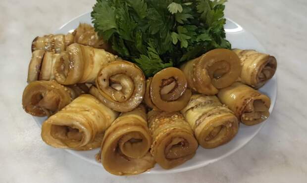 л. сахара; 1 ст.л. с небольшой горкой соли; подсолнечное масло для жарки. Как готовить Сначала делаем маринад - в воду добавляем все специи (кроме уксуса), доводим до кипения и оставляем для остывания. Уксус добавляется уже в холодный маринад. Синенькие очищаем от кожицы и нарезаем пластинами толщиной до 1 см. Жарим с небольшим количеством масла (солить не надо) с двух сторон 2-3 минуты. Чеснок очищаем и нарезаем пластинками. Каждый кусок баклажана макаем в маринад и укладываем в миску слоями, перемежая с чесноком - по несколько штук на пластину. Заливаем оставшимся маринадом и отправляем в холодильник минимум на сутки. Но чем дольше маринуется, тем будет вкуснее. Перед подачей пластины сворачиваем рулетиком, в середину помещаем чеснок.Если вам понравится эта закуска, на зиму делать так: поджаренные баклажаны сразу сворачиваем в рулет с чесноком, помещаем вертикально в чистые банки 0,5 л, заливаем готовым маринадом с уксусом, стерилизуем 20 минут с момента закипания, закатываем. Все!