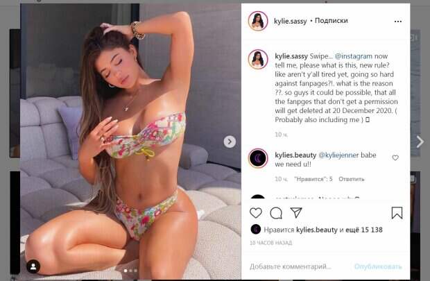 Сейчас красотой Кайли восхищаются миллионы людей, а поклонники создают фан-странички, посвященные ей. Так, в одной из таких групп появилось архивное фото знаменитости. На снимке Дженнер позировала, подогнув ножки под себя. Модель надела цветной купальник. Лифчик держался на груди, которая едва ли не вываливалась из него. Пышный бюст завораживал. Также на звезде были плавочки, обтянувшие самое интимное. Видно, что это были бикини, которое оголило ягодицы. Украшения сверкали и дополняли образ звезды, как и длинные ногти. За 10 часов пост собрал более 15 тысяч лайков и много комментариев. Пользователи сети написали в сторону красотки много приятных слов, которых достойна ее идеальная фигура. "Девушка-огонь", - написал один из поклонников. Ранее мы писали, что Кайли Дженнер демонстрировала свои пышные формы в миниатюрном черном купальнике-бикини. Маленькие треугольнички ткани едва прикрывают самые интимные места, практически не оставляя простора для воображения. Красотка эффектно позирует перед камерой, хвастаясь своим подтянутым тело и ровным загаром. Напомним, Кайли Дженнер позировала в зеленом топе. Другой одежды на красотке не было видно, девушка стояла слишком близко к камере. Дженнер без стыда хвасталась пышной грудью, которая прямо выпирала из топа. Напомним, соблазнительная Кайли Дженнер в откровенном купальнике показала все самое аппетитное Также Politeka писала, что разгоряченная Кайли Дженнер игриво приласкала себя на постели А еще Politeka сообщала, что знойная Кайли Дженнер в обтягивающем платье показала каждый изгиб фигуры без белья