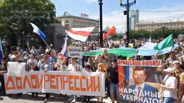 В Хабаровске в выходные прошли уже традиционные митинги противников власти, которые собираются после ареста обвиняемого в причастности к убийствам уже экс-губернатора Сергея Фургала. Акции протеста становятся малочисленне, но злее – в ход идут оскорбления президента Владимира Путина, телеведущих центральных ТВ-каналов, также появилась символика белорусских националистов – бело-красный флаг.