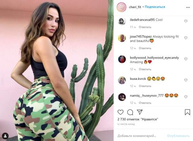 Дело в том, что Ана является не только фитнес-тренером, но еще и владеет специальным магазином для спортивных красоток. Чери едва ли не каждый день публикует тренировки в своих новых образах и всегда показывает подкачанные ягодицы, которыми очень гордится. К примеру, на одном из фото Ана подчеркнула достоинства новым образом. Она надела лосины с камуфляжным и дополнила спортивный лук тонким черным топом без рукавов. Вот как реагируют пользователи Инстаграм под постом: «❤️ красивый образ; Совершенство❤️❤️; Это мощное комбо !! ⚡️⚡️⚡️; спорт со вкусом
