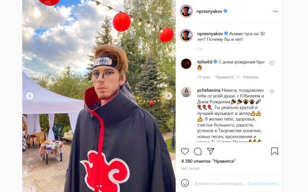 Так, Пресняков-младший устроил вечеринку в стиле аниме. Для нее он сам перевоплотился в одного из персонажей популярного аниме «Наруто» - Нагато, также известного как Пейн. Пресняков оделся в черный балдахин, а на голову надел характерную повязку. Кроме того, нос певца украсил массивный «пирсинг», как у персонажа. «Аниме туса на 30 лет? Почему бы и нет!», - подписал кадры Пресняков-младший. Его поклонники тут же принялись комментировать публикацию. «Никита, поздравляю тебя от всей души, с Юбилеем и Днем Рождения. Ты реально крутой и лучший музыкант и актер», «Ух ты!», «Похож!», «Царь, очень приятно Царь», «Круто», «С днём рождения Никита. Пусть твой голос почаще звучит везде и для всех», «Почему именно Пейн?))) интересен выбор именно этого персонажа», «Почему бы и нет?!», «Какие вы клёвые братишки! Никита, с днём рождения! Будь счастлив каждый день», «30 лет...как быстро», - пишут люди. Напомним, внуку Пугачевой стукнуло 30 лет, как он сейчас выглядит и чем занимается: "Время летит". Как сообщала Politeka, юная невестка Орбакайте похвасталась, как они обживают особняк Пугачевой: "Наконец-то взяли джакузи". Также Politeka писала, что внешность заросшего внука Аллы Пугачевой вызвала фурор: "Обалдеть, ксерокопия".