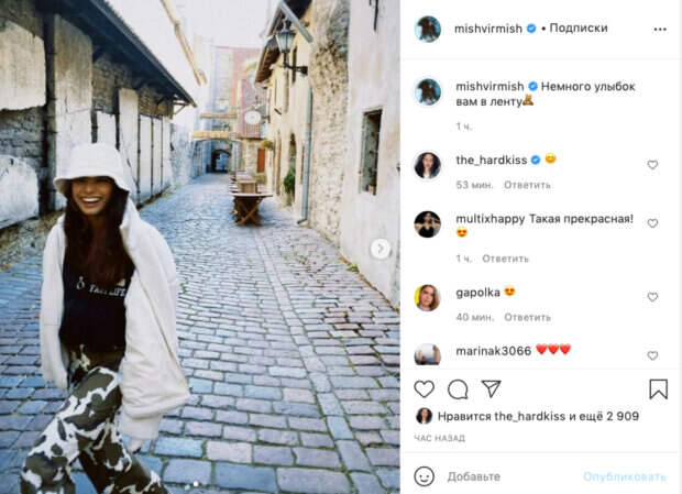 Также, она является ведущей популярной программы "Орел и решка". На этот раз певица показала новые фото на своей странице в Инстаграм. На снимках Мишель гуляет по улицам города и позирует на камеру в стильном наряде. На ней комуфляжные брюки и черная толстовка. Свой образ певица дополнила панамкой и курткой белого цвета. Ранее она сообщала, что находится вместе со съемочной группой "Орла и решки" на острове Кипр. "Немного улыбок вам в ленту", - поделилась Мишель Андраде. Фанаты артистки оставили ей множество приятных слов в комментариях: "Такая прекрасная!", "Мисс Боливия", "Ми, когда концерты? Мы скучаем!", "Пусть вся Ваша жизнь будет наполнена улыбками !!!", "Милая и лучезарная Мишель Андраде". Ранее сообщалось, звезда "Орел и Решка" Андраде засветилась за границей с известным красавчиком: "Чем они похожи..." Также, Мишель Андраде с партнером-звездой "Орла и Решки" насмешила новым видео: "Йоу, йоу, полегче" Politeka рассказывала, звезда "Орел и Решка" Андраде после травмы показала, как теперь приходиться есть: "Выздоравливай..."