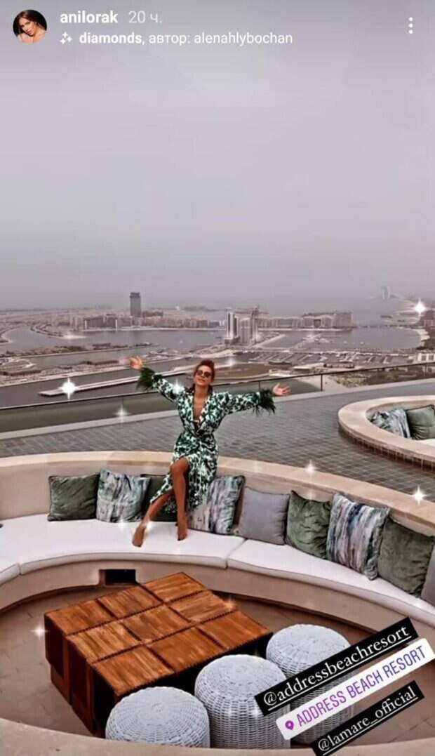 Однако недавно Ани Лорак выпустила новую песню на украинском языке, после чего её позвали обратно в Украину. Стало известно, что после съемок нового клипа певица отправилась на дорогостоящий отдых в Арабские Эмираты. Отель, в который отправилась Ани Лорак, часто посещают разные знаменитости. Певица опубликовала фото, с панорамного вида на террасе отеля. Также на кадрах можно увидеть безбрежный бассейн, который находится за спиной Ани Лорак. Стоимость одной ночи в отеле с шикарным видом составляет от 18 072 гривен до 397 600 гривен. Ранее сообщалось, экс-муж Ани Лорак повторил экстремальное свидание, но уже с новой возлюбленной: "С Каролиной тоже есть такое..." Также, Лорак после премьеры украиноязычного клипа устроила горячее дефиле в откровенных образах: "Опять помолодела" Politeka рассказывала, Мишина, жена "Холостяка" Добрынина, Лорак и другие показали, кто из них краше: "Вас не включили, вот и беситесь"