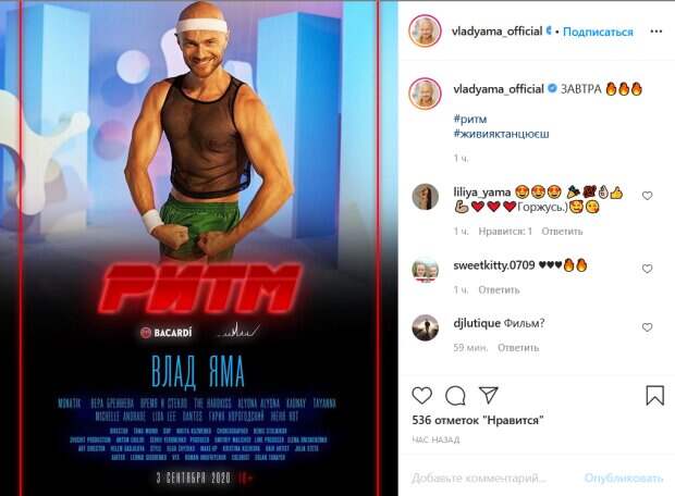 Главных героев в нем играет сам певец и целый ряд украинских знаменитостей, среди которых оказался и Яма. Хореограф поделился в Инстаграм афишей мюзикла со своим персонажем. Судя по всему, ему предстоит сыграть любителя спорта. Так, на фото Яма демонстрирует свой накачанный пресс и руки в весьма оригинальном наряде. На нем зеленые спортивные штаны, полупрозрачная майка и повязка на голове. В комментариях к фото отметилась жена танцора, которая коротко написала: «Горжусь». Поклонники Ямы также не смогли пройти мимо такого поста и буквально засыпали артиста лайками и вопросами о предстоящей премьере. Ранее мы писали, что Яма опубликовал кадры новой тренировки. Хореограф встал на четвереньки. Коленки он поставил на коврик и двигался вперед, выполняя упражнения с гантелями. При этом ноги Влада были сплетены в крест. Видно, что танцор был доволен своими занятиями, ведь он улыбался, прищурив глаза. "Это же кайфушки", - подписал кадры артист. Напомним, Влад Яма устроил жаркую тренировку под палящим солнцем: "Кайфушки". Как сообщала Politeka, Влад Яма подчеркнул накаченные мышцы обтягивающей рубашечкой: "Офигенный". Также Politeka писала, что лучезарный Влад Яма прижался к желанному трофею, озадачив признанием.