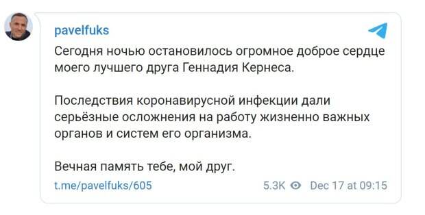 Вечная память тебе, мой друг", - написал Фукс. Напомним, Геннадий Кернес давно болел. Ранее СМИ сообщали, что у мэра Харькова отказала вторая почка.