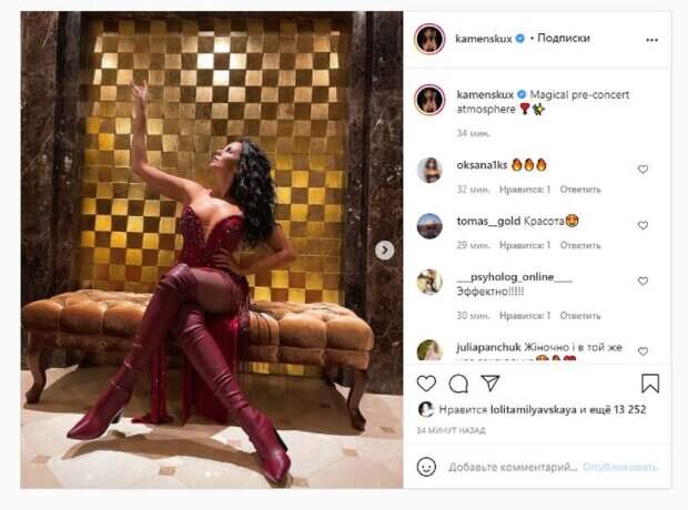 На новых фото Настя позировала в ярком корсете с вырезом, который эффектно подчеркнул формы девушки. Красотка сидела на диванчике, демонстрируя свою роскошь. "Волшебная предконцертная атмосфера", - написала девушка под фото. Фанаты поставили более 13 тысяч лайков и написали комментарии: "Красотка", "Эффектно", "Женственно и в то же время соблазнительно", "Кошка-тигрица", "Боже мой, да какая же она красивая", "Очень красивая", "Эстетично, изыскано", "Хорошего выступления, девочки", "Потрясающая певица Анастасия Каменских", "Атмосферно, красочно, , женственно! Ох, все как я люблю". Напомним, выступление Каменских оказалось под угрозой срыва, понадобилась срочная медицинская помощь А еще Politeka сообщала, что Каменских в купальнике показала, как наслаждается гастролями в теплых краях Также Politeka писала, что Настя Каменских в шелковом халатике подогрела слухи о своей беременности
