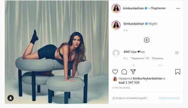 Ким приняла довольно горячую позу, из-за которой она едва не вывалила бюст. Красотка немного выгнулась и приняла позу на четвереньках. Упираясь о руки, она выставила стройную ножку в носочке. Упругие ягодицы прекрасно смотрелись в обтягивающих шортиках и впечатляли красотой. Завершил образ красивый кулон на шее. Ким втянула животик, и посмотрела вперед, приоткрыв губы. Волосы звезды были распущенными и красивой волной опустились на плечо. "Ночь!", - подписала снимок Ким. За шесть часов пост собрал более одного миллиона лайков и много комментариев. Пользователи сети по достоинству оценили жаркий образ модели, написав ей массу приятных слов. "Очень эффектно", - написал один из поклонников. Ранее мы писали, что Ким Кардашьян рассказала, что идет на большие жертвы, чтобы ее тело было идеальным. Оказывается, звезда просто одержима идеей избавиться от лишних килограммов. Звезда стала выпускать собственную линейку утягивающего белья, которое ей самой помогало после родов. Люди восхищались фигурой недавно родившей женщины, но та говорила, что носит корректирующее белье и в этом и есть ее секрет. Красотка сейчас не носит обычные бюстгальтеры и стринги, отдавая предпочтение моделям из натурального хлопка. Напомним, Ким Кардашьян со знойной сестричкой Кортни впечатлили аппетитными видами в бикини А еще Politeka писала, что томная Ким Кардашьян в гладеньком костюме изящно присела на корточки Также Politeka сообщала, что пышногрудая Ким Кардашьян порезвилась на природе, обтянув свои прелести «невидимой» тканью