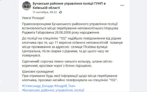 Правоохранителями Бучанского районного управления полиции устанавливается место пребывания несовершеннолетнего 15-летнего Норцова Раджиш Габаровича разыскивают в пгт Песковка Бучанского района Киевской области. 11 сентября он оставил место жительства и сейчас его местонахождение неизвестно. Об этом сообщили в пресс-службе Бучанского районного управления полиции в Facebook.