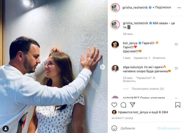На этот раз телеведущий опубликовал новую серию фото на своей странице в Инстаграм. Григорий Решетник решил показать горячие кадры со своей женой - Кристиной. Как известно, супруги вместе около 10 лет и у них уже трое детей - сыновья Иван, Дмитрий и Александр. На кадре - Григорий припирает к стенке Кристину и смотрит на неё. "Мой океан - это ты", - признался в чувствах Григорий Решетник. Поклонники супругов оставили множество приятных слов в комментариях: "Горячие! Красивые! Счастливые!", "Ух, какие горячие! Наверное скоро будет девочка", "Очень красивая пара", "Красивые! Обожаю вашу пару", "Любовь во взгляде", "Какие вы молодцы! Пример для многих", "Сколько страсти". Ранее сообщалось, Решетник ненароком "рассекретил" избранника "Холостячки" Огневич, показательное видео: "Все только начинается" Также, Решетник показал, что творилось за кадром "Холостячки" со Златой Огневич: "Больше всего переживают..." Politeka рассказывала, ведущий "Україна має талант" Решетник признался, какой тяжелый путь преодолел: "Вновь находил в себе силы"
