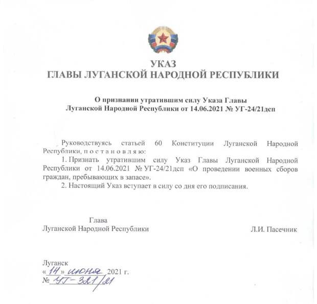 06.2021 по 19.06.2021; с 22.06.2021 по 26.06.2021; с 29.06.2021 по 03.07.2021», — говорилось в «документе». Но позже Пасечник передумал и решил сборы не проводить. Оба «указа» датированы 14 июня, но об отмене сборов стало известно сегодня к полудню. Предполагаем, что в «ЛНР» решили дождаться результатов переговоров Путина и Байдена в Женеве, которые запланированы на 16 июня. Стоит ли готовить резервистов к возможному обострению на Донбассе, определят по окончании саммита. Напомним, после предыдущих сборов не прошло и месяца. Учения в обеих «республиках» проводились с 17 по 22 мая. Отметим, что впервые за 7 лет конфликта на неподконтрольной Киеву территории так активно призывают резервистов. В «ДНР» пообещали, что до конца года в учебке побывают все мужчины призывного возраста, и во избежание неприятностей с «силовыми органами» посоветовали не уклоняться от сборов. Также нынешней весной здесь впервые был организован призыв в «армию». Он был добровольным. Но, по данным источников Klymenko Time, с осени его планируют сделать обязательным и регулярным. Понравился материал? Поставьте ему 5 звезд. Это важно для автора. Если у вас есть интересная информация о ситуации в Донбассе, которой вы хотите поделиться или опубликовать на наших площадках, пишите нам в Телеграм на @KlymenkoTimeDonbass_bot или klymenko. time@gmail.com. Полную анонимность наших источников со своей стороны мы гарантируем.