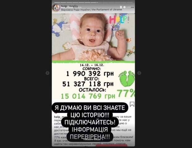 Дети с таким недугом не доживают и до двух лет. Сначала у них отказывают конечности, далее шея, а затем пищеварительная и дыхательная системы. Чтобы вылечить малышку необходимо сделать один-единственный укол Zolgensma, стоимость которого составляет почти 70 миллионов гривен (2234031 долларов). По состоянию на 16 декабря 2020 удалось собрать более 51 млн гривен, то есть 77% от необходимой суммы. "Zolgensma" — генотерапевтичний препарат, разработанный швейцарской компанией Novartis. Он используется для лечения спинальной мышечной атрофии у детей до двух лет. Спинально-мышечная атрофия - это очень редкое заболевание. У невропатолога из Херсона, который постал малышке этот диагноз, это первый случай за его 32-летнюю практику. Дарья и Эдуард Сахно очень надеются на помощь неравнодушных. Любая перечисленная сумма помагает приблизить выздоровление их дочки, маленькой Маши. Напомним, беда у Леси Никитюк, слабонервных просит не смотреть: "Как выглядит рана...", фото. Как сообщала Politeka, беда настигла Лесю Никитюк, появились кадры рискованной операции: "О Господи, держитесь" Также Politeka писала, что мест нет, врачи болеют, а персонал увольняется: главврач рассказал о катастрофе в киевской больнице.