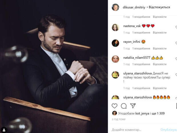 Умираю и утром вновь рождаюсь. Звучит жестко, но после того, как научился умничать, захотелось научиться закрыть рот и послушать. Поэтому, по утрам полезно вспоминать, что всё что ты там знаешь, уже вчерашняя информация... Всем привет!», - подписал фото Дикусар. В комментариях ему оставили массу откликов и комплиментов. «Дима! Я не пойму твоих проблем! Ты супер!», «Какой вы...Это не просто красивые фото..чувствуется, что в них ваша сущность, ваша душа..Вы не играли, не думали как будете выглядеть - просто были собой и вот в этом всё очарование!», «Очень глубокое фото», «Ну почему? Почему ты такой?», «Хватит умничать)))Ждём еще глубоких фотографий», - пишут пользователи сети. Как известно, Дикусар три года прожил в гражданском браке с певицей Ириной Билык, которая была намного старше танцора. Парочка познакомилась во время участия в проекте «Танцы со звездами». Напомним, что Дикусар впервые признался, что его связывает с замужней Шоптенко: "Мы до сих пор...". Как сообщала Politeka, Дикусар впечатлил формой в образе расслабленного мачо: "Даже через экран пошла...". Также Politeka писала, что Дикусар зацепил Булитко из "Дизель шоу", расположившись на полу: "Первая фотка огонь!".