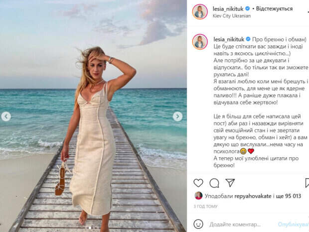 Но нужно за это благодарить и отпускать.. только так вы сможете двигаться дальше! Я вообще люблю, когда мне врут и обманывают, для меня это как ядерное топливо! А раньше очень плакала и чувствовала себя жертвой!», - призналась грустная телеведущая. По ее словам, она решила поговорить о сокровенном, чтобы «выровнять свое эмоциональное состояние и не обращать внимание на ложь». Телеведущая пошутила, что времени на психолога у нее нет, поэтому она решила излить душу в Инстаграм. Также красотка поделилась своими любимыми цитатами про обман. «Если не хотите портить отношения с человеком - не мешайте ему врать. Доктор Хаус. Для вранья нужны двое. Один врет, другой слушает. Симпсоны», - написала Никитюк. В комментариях телеведущую стали поддерживать ее поклонники. «Леся, ты прекрасна! Сарафан бомба», «Шикарная», «Как красиво», «Шикарная девушка. Супер», «Лесюнь, ты бесподобна», «Самая любимая ведущая Орла и решки!», «Вы непревзойденная! Вдохновляете своим оптимизмом», «Наша звездочка», - пишут пользователи сети. Напомним, что Никитюк не сдержала чувств в ресторане и взволновала бесстыжим декольте: "на грани приличия". Как сообщала Politeka, Леся Никитюк в меховых трусах пожаловалась на ужасные условия в Киеве: "Приезжаешь с Мальдив. ..". Также Politeka писала, что Никитюк в дерзком бикини показала, что у нее общего с Ким Кардашьян: "Тут без ДНК теста видно...".