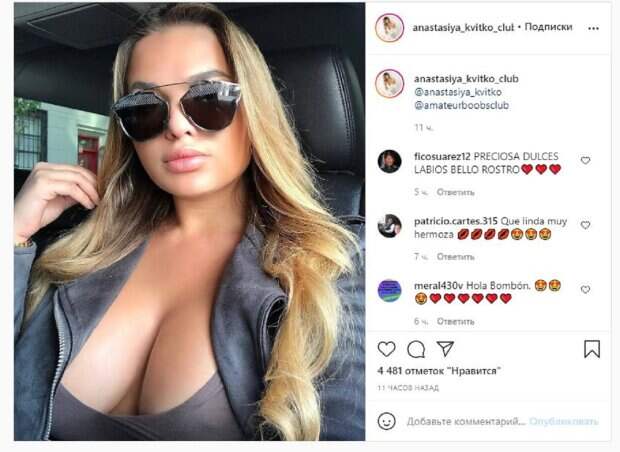 Известная модель Анастасия Квитко, которую называют русской Кардашьян, показала себя в новом образе На фото Квитко позирует в куртке, которую расстегнула, и стильных очках. Звезда сидела в автомобиле, показывая большое декольте, из которого прямо выпирал бюст. Девушка волосы оставила распущенными, а смотрела прямо в камеру.