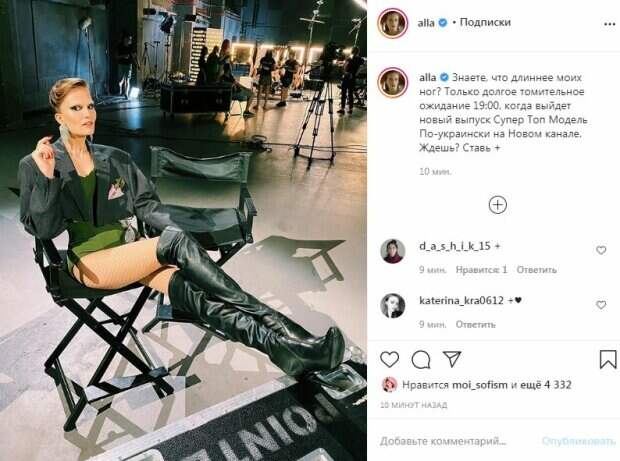 Ботфорты красотки были на шпильках, отчего ножки казались еще длиннее. Также модель была в зеленом боди, сверху которого надела укороченный пиджак. Завершили образ сверкающие украшения и яркий макияж. "Знаете, что длиннее моих ног? Только долгое томительное ожидание 19:00, когда выйдет новый выпуск Супер Топ Модель По-украински на Новом канале. Ждешь? Ставь +", - написала звезда. Всего за 10 минут пост собрал более 4000 лайков и много комментариев. " Кайфовааая♥️", "вы очень красивая!!!