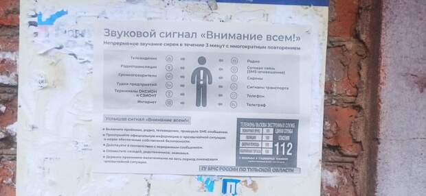 В Тульской области на домах начали появляться листовки с указаниями, как вести себя при звуковом сигнале «Внимание всем!». Отмечается, что он представляет собой непрерывное звучание сирен в течение трех минут с многократными повторениями. Помимо инструкции с действиями на листовках указаны номера телефонов экстренных служб, и внизу бумаги указано «ГУ МЧС России по Тульской области».