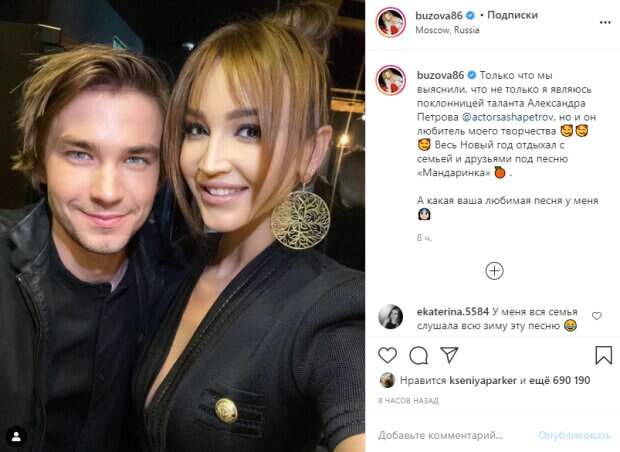 "Только что мы выяснили, что не только я являюсь поклонницей таланта Александра Петрова @actorsashapetrov, но и он любитель моего творчества