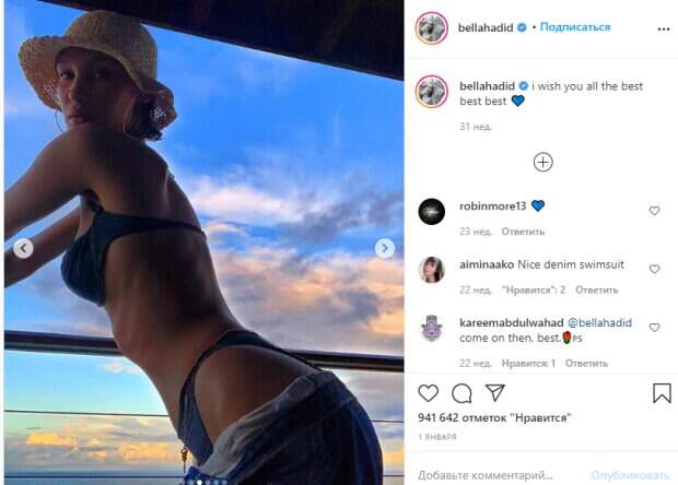 Как известно, девушка удивила не так давно исхудавшей фигурой и ей даже пришлось дать комментарий по этому поводу: «Я действительно не хотела так сильно худеть, и сейчас хочу вернуть на место грудь и задницу. Не моя вина, что требования к современным моделям такие жесткие! Да, колебания веса у меня очень сильные, и я не хочу больше говорить об этом. В конце концов, мы все очень разные», ─ сказала Белла. А вот что пишут пользователи под новым фото: «Я желаю вам всего наилучшего»,»Красивый джинсовый купальник», !@bellahadid давай, лучше», «@theweeknd нужен вам !! 😭», «Если бы я только был в этих мыслях, это просто кайф❤😉», «Ты идеальный ангел💕», «хорошо выглядишь», «"В данном случае выбор U - УДАЧА ... БЕЛЛА"», «Расскажите нам о своих тренировках !!!! 👏👏👏👏». До этого Эмили Ратаковски показала, как веселится с Беллой Хадид на пляже. Как известно, девушки известны благодаря своим стройным и подтянутым фигуром. Свои достоинства Эмили и Белла демонстрируют с легкостью и без смущения. Являсь моделями, одними из самых популярных в мире, девушки также любят эпатировать публику совместными появлениями. Моделям удается поражать сеть не только на показах и во время вечеринок. Девушки также любят актиный отдых, поэтому уже не раз светились во время развлечений на пляже. На одном из таких фото Эмили и Белла показали, как веселились, разъезжая на скутерах у берега. При этом обе красотки были в одних лишь черных бикини, удачно подчеркнувших их стройные тела. Фанаты сразу же отметили, что эти девушки "Ангелы, которым нравится шалить на пляже". Напомним, знойная Белла Хадид засветила самые аппетитные места в дерзком наряде А еще Politeka писала, что жаркая Белла Хадид сверкнула округлостями в неприличном купальнике Также Politeka сообщала, что мокрая Белла Хадид пошалила на камеру, горячие кадры