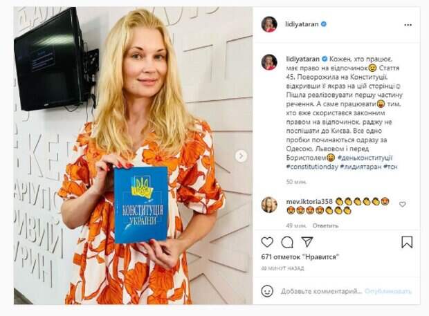 Красотка в руках держала Конституцию Украины, посвятив этому целый пост: "Каждый, кто работает, имеет право на отдых. Статья 45. Поколдовала на Конституции, открыв ее как раз на этой странице. Пошла реализовывать первую часть предложения. А именно работать тем, кто уже воспользовался законным правом на отдых, советую не спешить в Киев. Все равно пробки начинаются сразу за Одессой, Львовом и перед Борисполем". Фанаты поставили сотни лайков и написали комментарии: "А когда начнется реализация второй части?", "Интересно, а социальный отдых, это что такое", "А в деревне, жаль, нет отдыха". Напомним, звезда «1+1» Лидия Таран показала, как работается при сильной жаре А еще Politeka писала, что звезда 1+1 Лидия Таран раскрыла секрет идеальной фигуры Также Politeka сообщала, что звезда 1+1 Лидия Таран в купальнике поманила клубничкой, фото