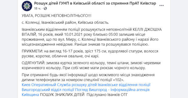 Полиция все силы бросила на его поиски, но без помощи они пока не могут разыскать парня Полиция разыскивает 16-летнего парня с необычным именем - Виталий Келли Джошуа. Парень 10 января около 05:00 оставил место жительства по ул. Мира, с. Коленцы Иванковского района Киевской области и исчез. Об этом говорится в сообщении полиции Киевской области.