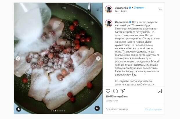 net. "Очень крутой вкус. Это пародоксальное варенье из бекона тупо цепляет за живое. Ты сначала думаешь, как это вообще возможно. А потом пробуешь и проникаешься до глубины души философией этого сочетания. Мягкий хлебец, ягодно-карамельный вкус с пряными и упругими элементами. В конце все ощущения обостряются за счет творога. Вау", - отмечает ресторатор. Процесс приготовления довольно прост: Батон нарезаете и ставите в духовку, чтобы он немного подсушился. Бекон жарите с клюквой, сахаром и небольшим количеством воды, пока вся масса не загустеет. Затем карамелизированный бекон с клюквой надо порубить ножом, чтобы оно приобрело более однородную структуру. На хлебные кружочки выкладываете кусочки твердого выдержанного сыра. Сверху на хлеб с сыром выкладываете то самое варенье и листья петрушки. "Вот и все. Закуска, от которой жизнь становится лучше, готова», - отметил Клопотенко. Напомним, что победитель "Мастер Шеф" Клопотенко создал полезную альтернативу салату "Мимоза": "заберет в плен вашу душу» Как сообщала Politeka, победитель "Мастер Шеф" Клопотенко поделился гениальным рецептом чизкейка: всего 5 минут и без запекания. Также Politeka писала, что Клопотенко раскрыл секрет сочных чебуреков: "Жареное счастье".
