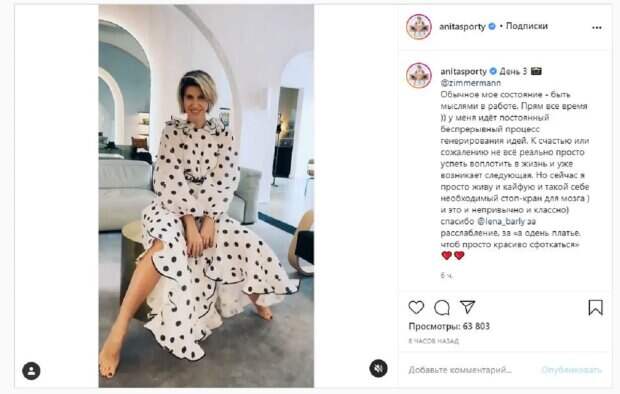 net со ссылкой на страничку знаменитости. "Обычное мое состояние - быть мыслями в работе. Прям все время )) у меня идёт постоянный беспрерывный процесс генерирования идей. К счастью или сожалению не всё реально просто успеть воплотить в жизнь и уже возникает следующая. Но сейчас я просто живу и кайфую и такой себе необходимый стоп-кран для мозга ) и это и непривычно и классно)", - написала звезда под постом. Фанаты посмотрели кадры более 60 тысяч раз и написали комментарии: "Какая красотка и кокетка", "Анита!!! Вы такая разная и такая классная", "Потрясающее платье! Вам оно очень идёт, Анита! Вы красотка!", "Сногсшибательные , а платье где покупали ?", "Зажигательная кокетка". Мы писали, что украинская спортсменка Анита Луценко, тренер проекта «Зважені та щасливі» оседлала известного издателя. На фото она позирует, сидя на столике в полупрозрачной блузке с коротким рукавом, черных брюках и красных полусапожках. Ее лицо прикрывают волосы, поскольку звезда немного повернула его. Напомним, тренер «Зважені та щасливі» Анита Луценко впервые рассказала о большой потере Также Politeka писала, что тренер «Зважені та щасливі» Анита Луценко задрала платье и показала свою женственность А еще Politeka сообщала, что тренер «Зважені та щасливі» Анита Луценко внезапно обратилась за помощью, подробности